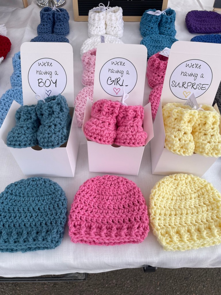 Baby Announcement Hat and Booties Gift Set (white / yellow / pink / blue)